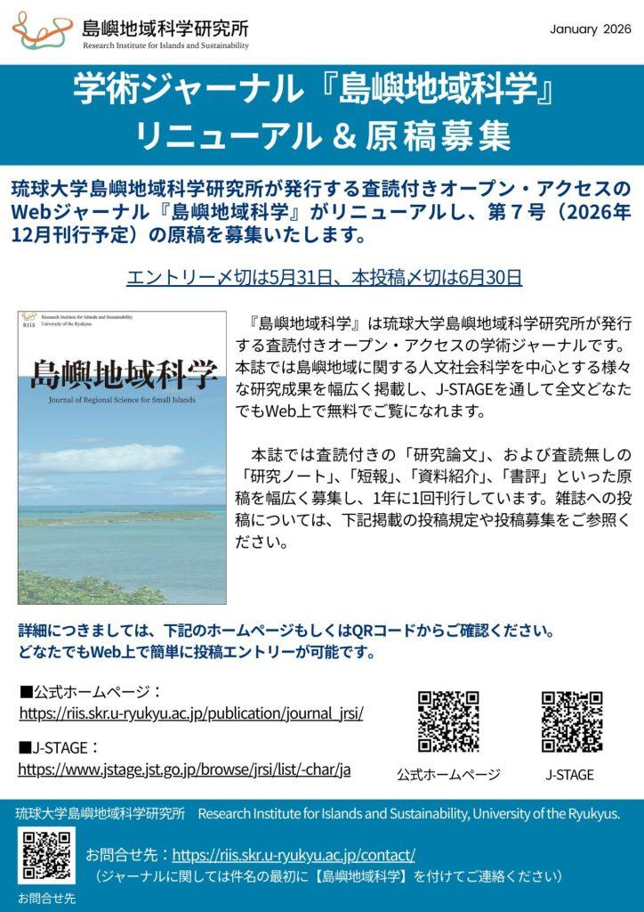 琉球大学島嶼地域科学研究所が発行する査読付きオープン・アクセスのWebジャーナル『島嶼地域科学』がリニューアルし、第7号(2026年12月刊行予定)の原稿を募集いたします。